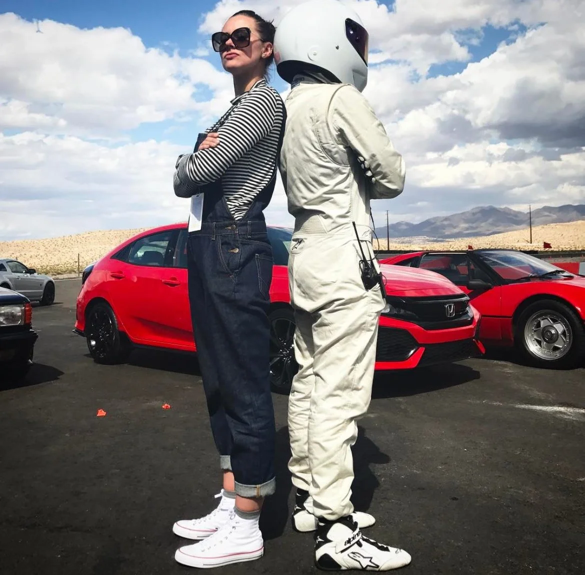 (A fun photo moment with The Stig as the social producer on the set of Top Gear America.)